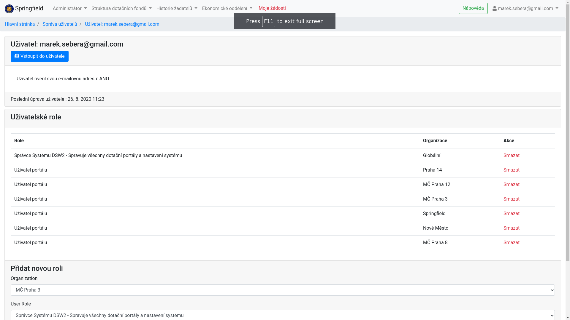 • Správa uživatelských účtů, a to jak zaměstnanců úřadů, tak i žadatelů.